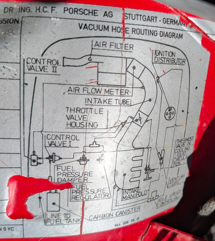 One fun part of reviewing the engine is understanding what’s happening in vacuum hose land – finding leaks, randomly dangling tubes, etc. Also, it’s notable that this diagram is mounted on the inside of the engine bay. There is likely some expected stuff like fuel pressure regulation. But also some new stuff like emissions controls. Which we already checked/fixed for SMOGGED!.
