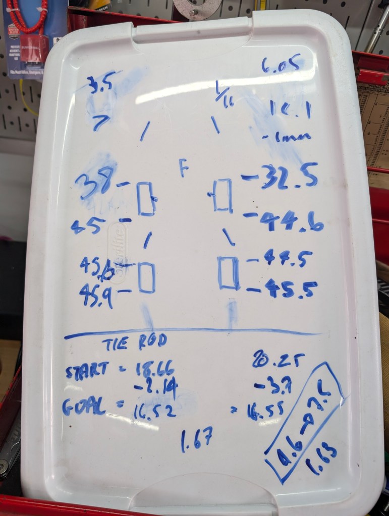 Translating things into 3D world seems to be the most consistent challenge now so this wasn’t a huge shock. What turned out to be much more cool was to start of using the string alignment method and then share some of the measurements, along with targets to get get a suggested number of turns for the tie rods? Still have to verify and check the final result, but if it’s off, it doesn’t look like much and beats the hell out of whatever we started to do here.